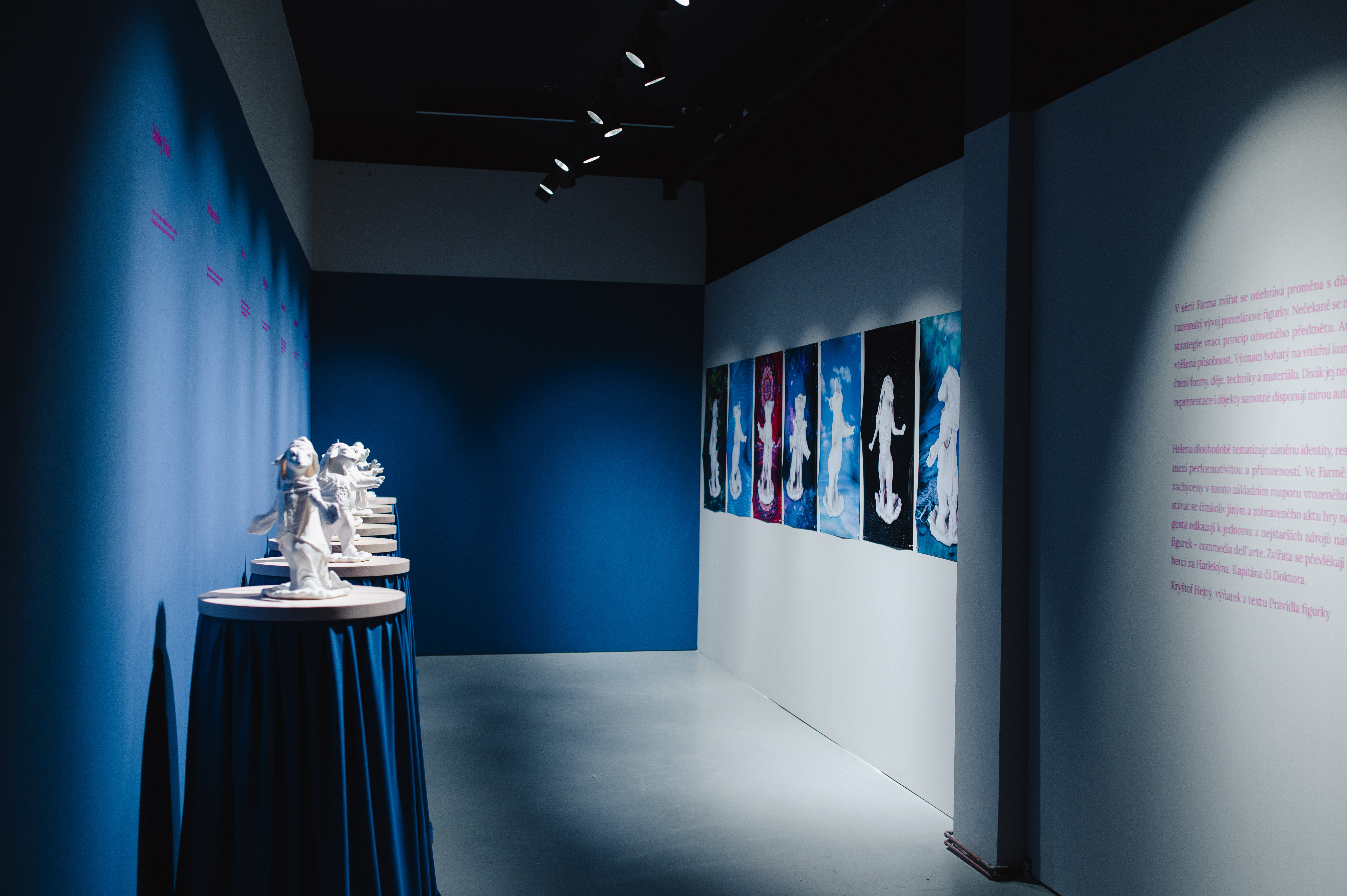 Výstava Farma zvířat představuje práci vycházející z doktorandského uměleckého a výzkumného projektu designérky keramiky Heleny Patelisové. Autorka se dlouhodobě věnuje tvorbě figurativní plastiky z porcelánu, v Domě umění Ústí nad Labem již v roce 2023 v rámci výstavy Zahrada ctností a neřestí představila kolekci Maskoti. Postavy ukryté v převlecích, které vypadají, jako by je ušil někdo o trochu větší a neohrabanější – Žralok, Raketa a Mochomůrka, jsou autoportrétem autorky v různých životních situacích. Autorský design, zobrazování lidských vlastností a špetka humoru, je to, co její tvorbu činí jedinečnou.