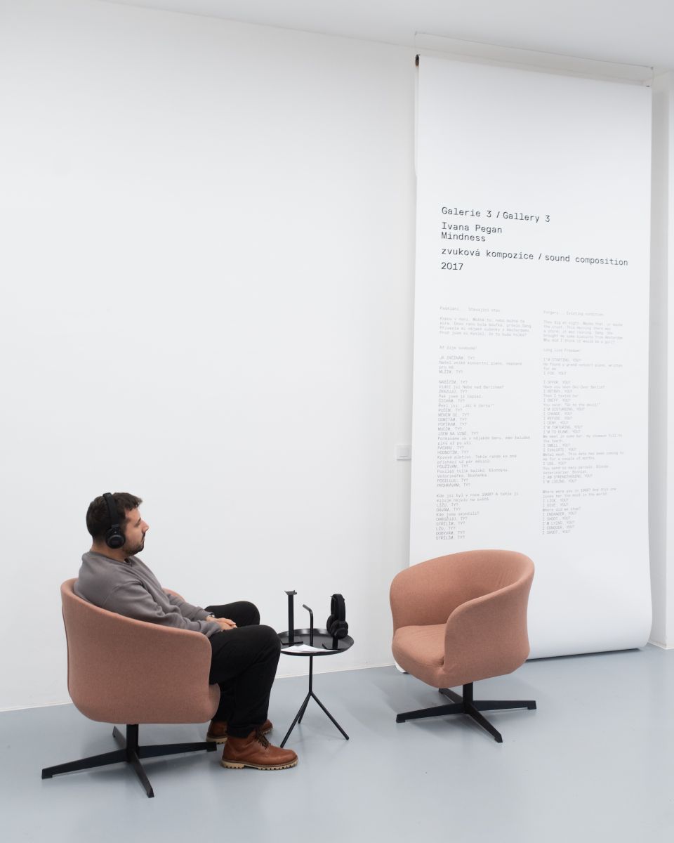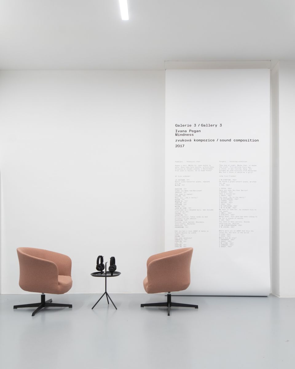 Zvuková kompozice Mindness, prezentovaná v Galerii 3, postupně strhává naši pozornost. Abstraktně nahlížíme do emocionálního rozpoložení člověka, kde se setkáváme s tokem různých myšlenek. Ivana Pegan pracuje s jazykem, písmem, řečí, hlasem, které následně zpracovává pomocí médií jako jsou poetické objekty, prostorové instalace ad.