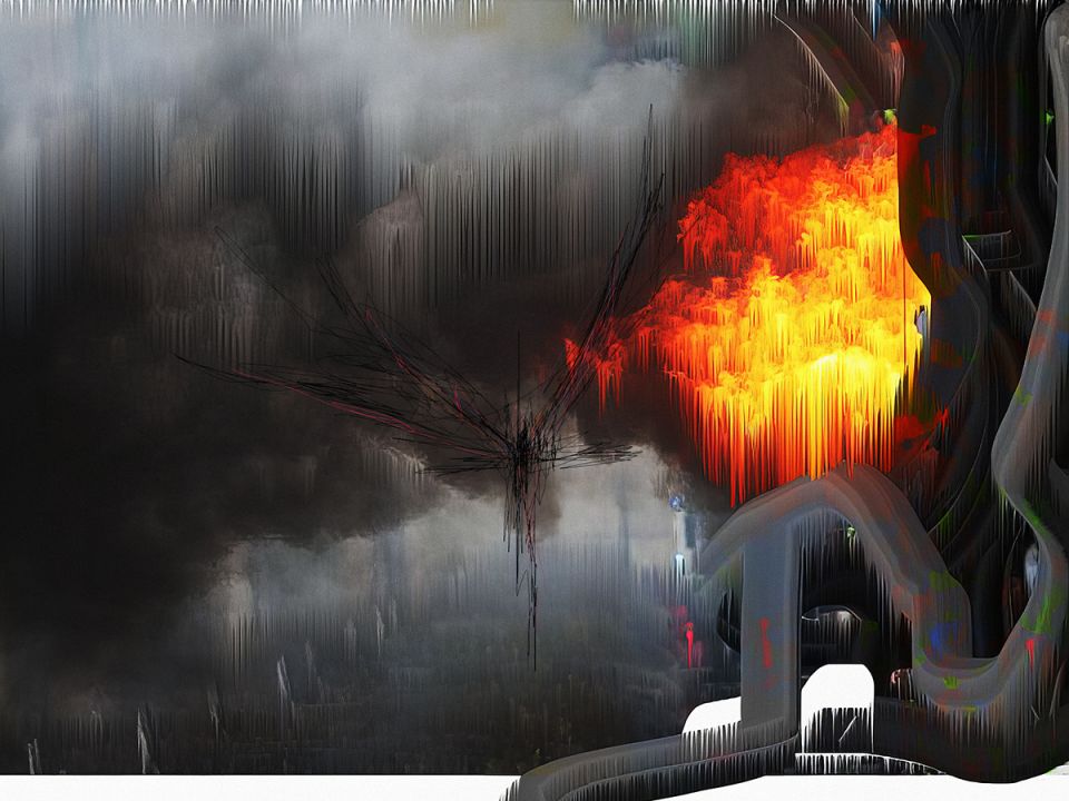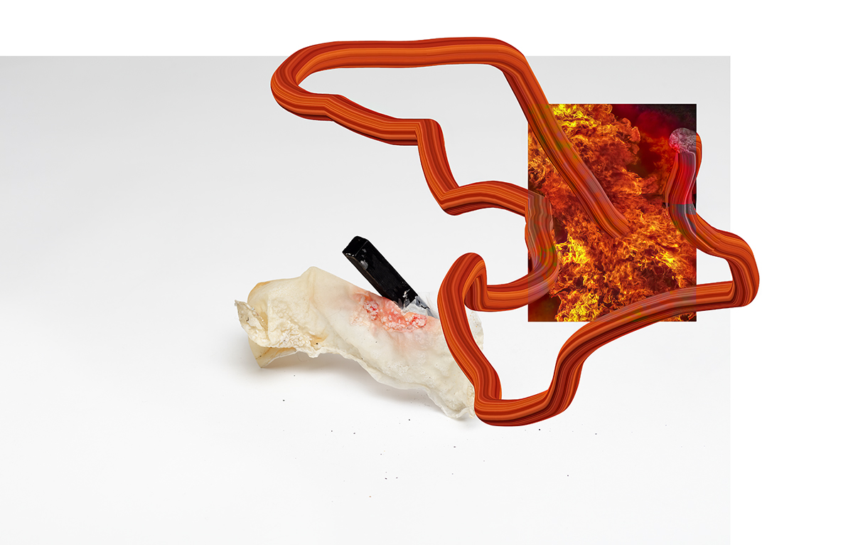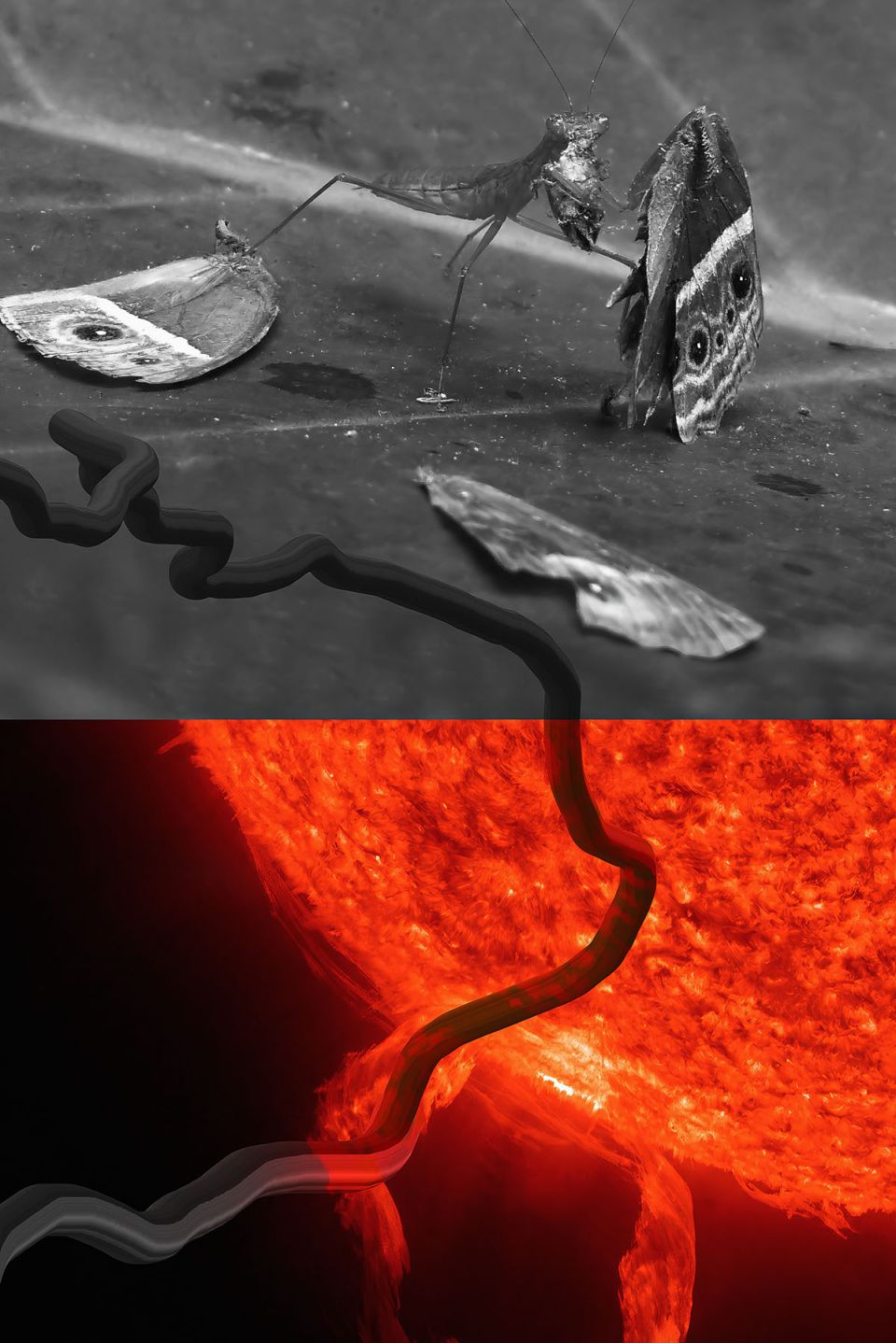 The installation at the Ústí nad Labem House of Art consists of lightboxes, large-format photographs, glass photographs, and video. It blends found and modified photographs with original digital drawings, mixing specific scenes with abstract ones. Thýn combines seemingly disparate scenes into a unified image, revealing underlying questions upon closer inspection. Themes include the carrying of a lifeless body, a praying mantis devouring a butterfly, a curious touch to an open wound, infinity, flames, eruptions, and fear. In the slow flow of a massive glacier's meltwater, we might ponder: Does hope have an end?